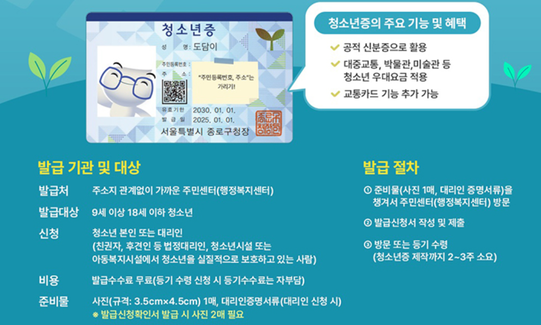 - 신청: 주민센터 방문 → 청소년증 발급 신청서 작성·제출(주소지 무관)