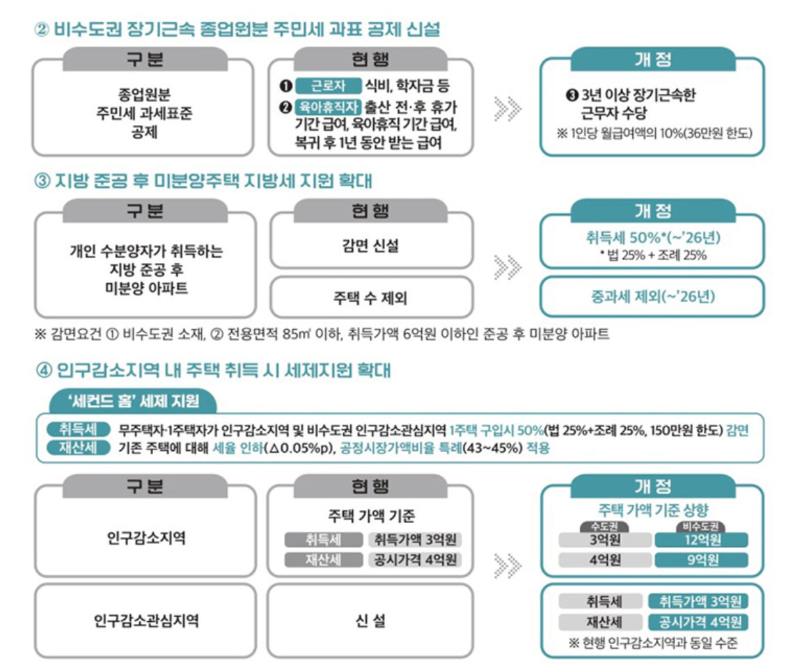 - 사원 주거 지원: 인구감소지역 내 사원 임대·무상 제공 목적의 주택·기숙사 취득세 50% 감면 신설.