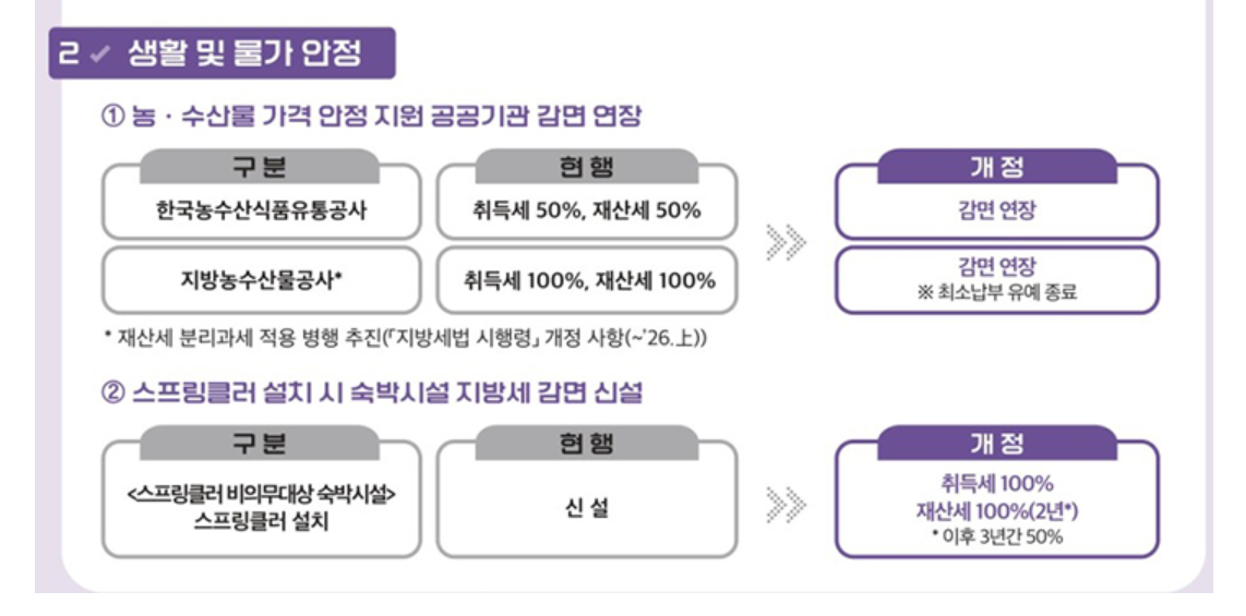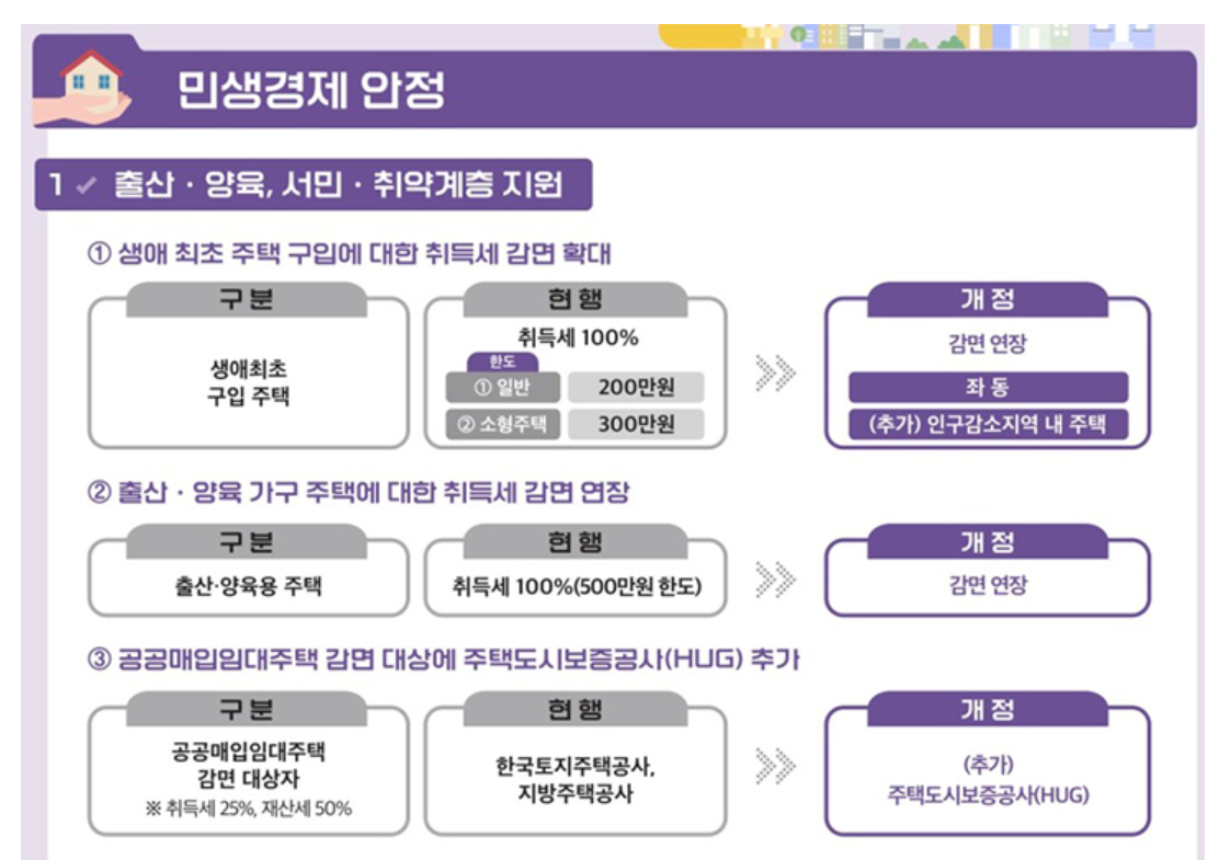 - 공공임대 확대: 공공매입임대주택 감면 대상에 HUG 추가, 사회복지·고용·안전 관련 공공기관 지방세 감면 연장.