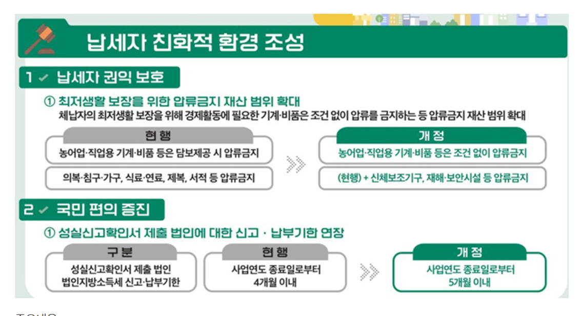 - 권익 강화: 납세자보호관의 불복절차 참여 확대, 압류금지 재산 범위 확대(생계·업무 필수 장비), 체납 관련 법 적용범위를 부과·징수·환급·유예까지 확대.