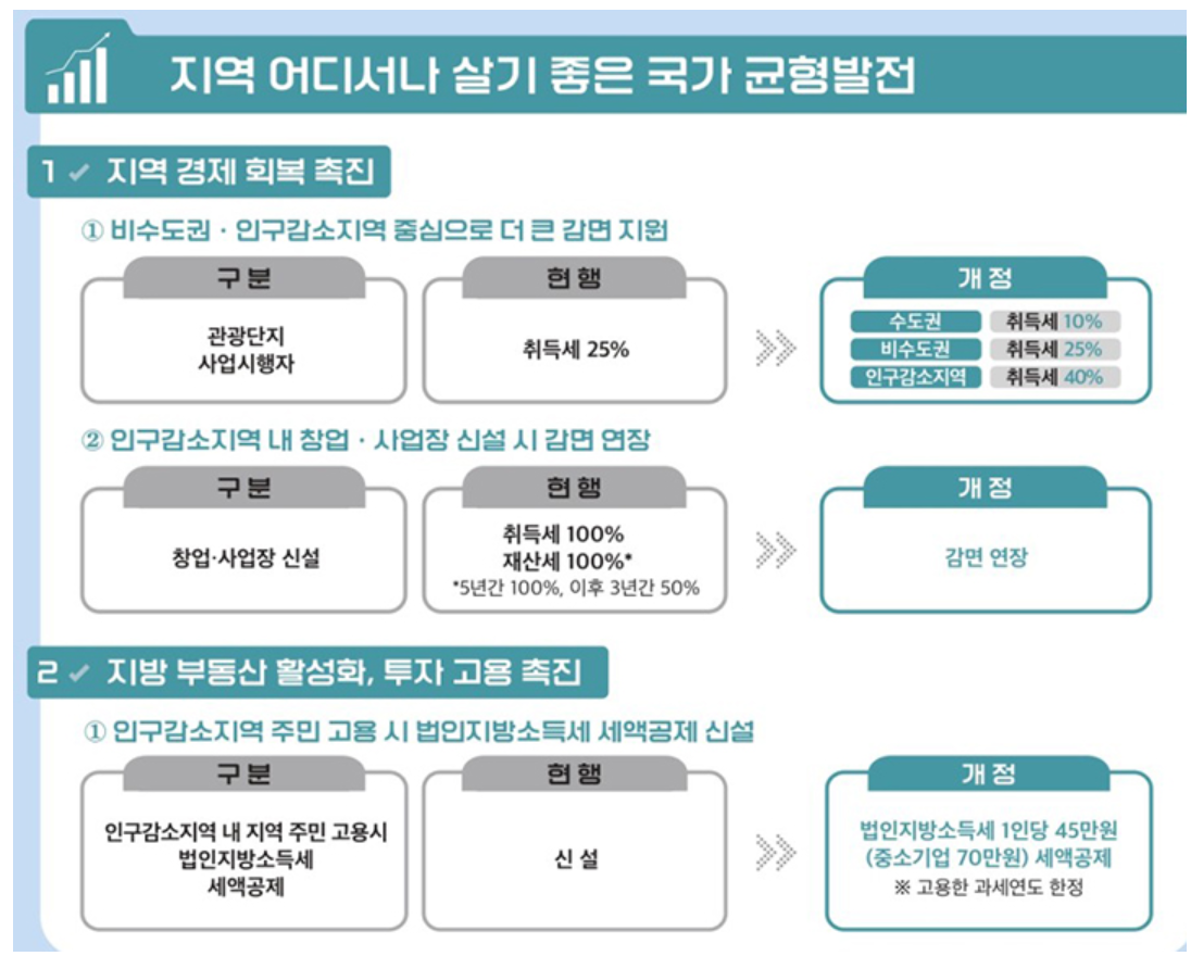 - 인구감소지역 세제 감면 강화: 산업·물류·관광단지 등에 지역 구분별 차등 감면(인구감소지역이 최고 수준).