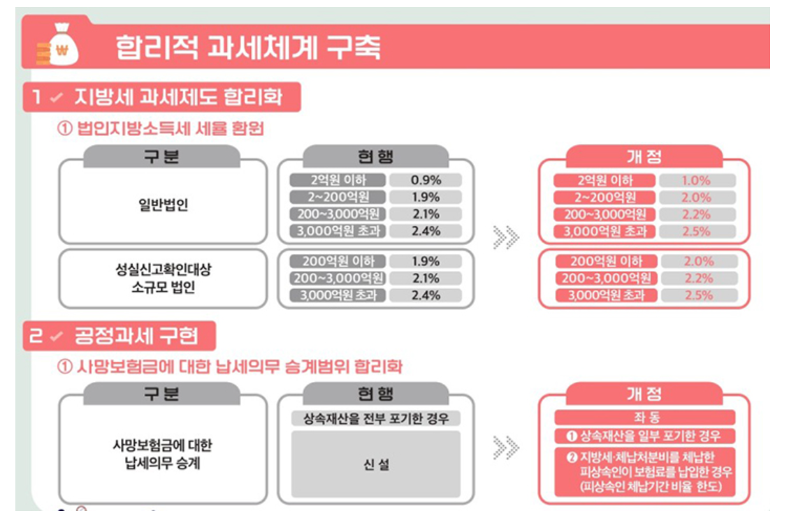 - 법인 편의: 성실신고확인서 제출 법인의 법인지방소득세 신고·납부기한 4→5개월 연장.