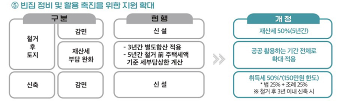 - 빈집 철거 후 토지 재산세 50% 감면, 신축 시 취득세 감면 신설.