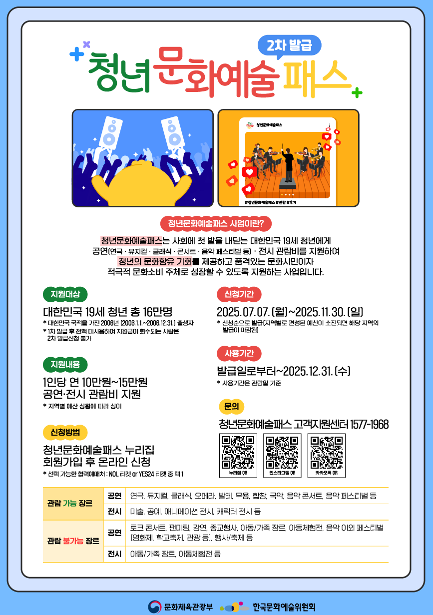 2025년 청년문화예술패스 2차 발급…19세 청년 공연·전시 관람비 최대 15만 원 지원