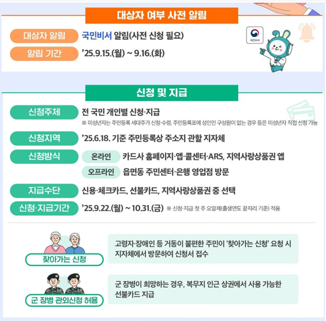 • 달라진 점: 군 장병 복무지 인근 사용 허용, 민생회복 소비쿠폰 사용처 확대(지역생협 등)