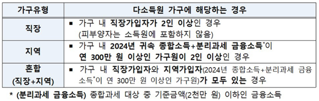2025년 6월 건강보험료 기준 소득 하위 90% 가구 구성원입니다. 다만 재산세 과세표준 합계 12억 초과 또는 2024년 금융소득 2,000만 원 초과 가구는 제외됩니다.