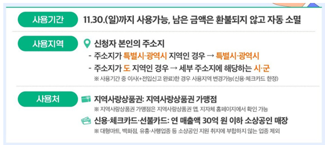 사용 기한은 11월 30일까지이며, 미사용 잔액은 소멸됩니다. 제한 업종을 제외한 소상공인 업종 전반에서 사용 가능하고, 지역생협(연 매출 30억 초과 포함) 등으로 확대되었습니다.