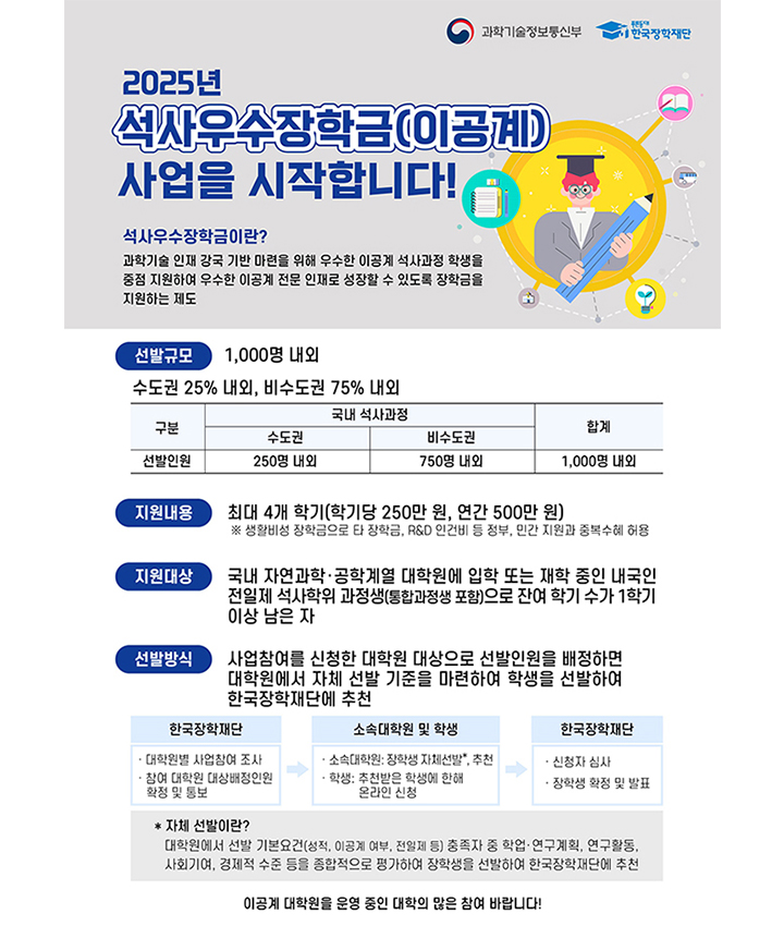 이공계 석사우수장학금은 전국 이공계 대학원 석사과정생 약 1000명을 선발해 학기당 250만 원, 연간 500만 원을 지급한다. 이 지원금은 생활비와 연구 활동을 보조해 학생들이 안정적으로 학업과 연구를 병행할 수 있는 기반을 제공한다.