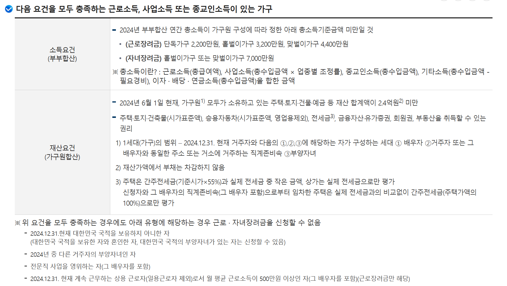 근로장려금 반기 신청은 근로소득만 있는 가구만 가능하다. 사업소득이나 종교인 소득이 조금이라도 있다면 반기 지급 대상이 아니며, 반드시 5월 정기 신청을 해야 한다.