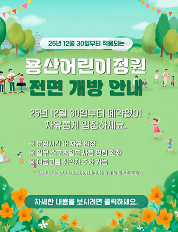용산어린이정원은 2025년 12월 30일부터 전면 개방되며, 임시개방 기간 동안 모든 국민이 자유롭게 방문할 수 있다.