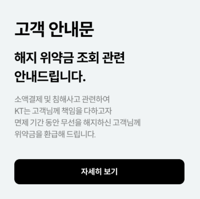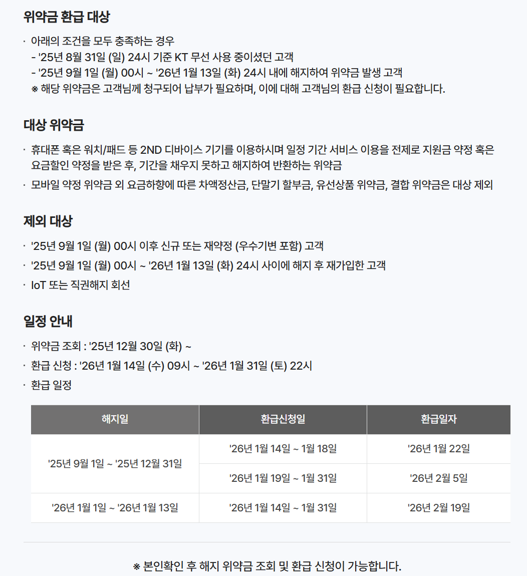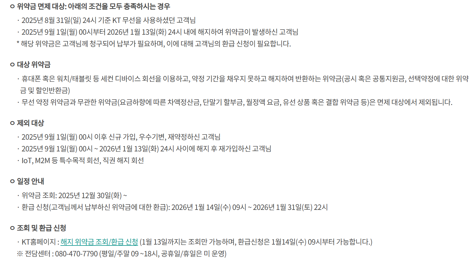 KT는 2025년 12월 31일부터 2026년 1월 13일까지 이동통신서비스 계약 해지를 원하는 고객을 대상으로 위약금 전액 면제를 실시한다.