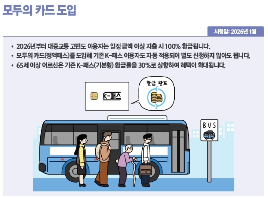 특히 65세 이상 어르신의 K-패스 환급률이 기존 20%에서 30%로 상향되어, 고령층의 이동권 보장과 교통비 절감 효과가 더욱 강화됩니다.