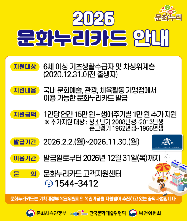 2) 2026 문화누리카드 지원금: 15만원 / 16만원 (대상별)