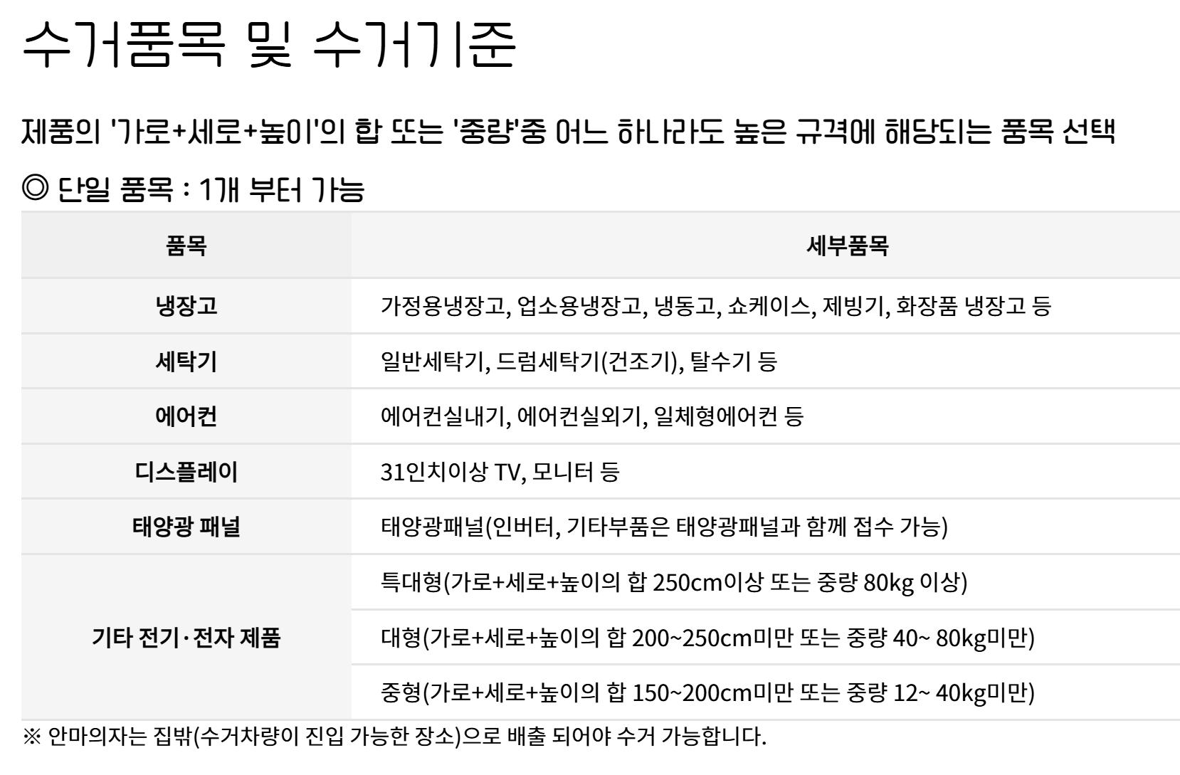 - 에어컨: 벽/천장 설치 제품은 기본 철거 완료 상태여야 수거 가능